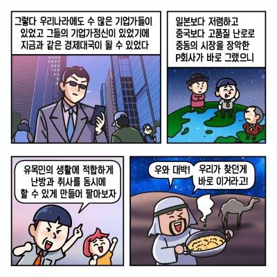 집에 돌아와 나는 궁금증을 참지 못하고 인터넷을 검색했다. ‘FILA Korea’, ‘르까프’ 등 국산 브랜드가 있다는 사실을 알게 되었다. 그러나 세계 시장 점유율을 확인하는 순간 또 한 번 놀랐다. 나이키와 아디다스 두 회사가 전체의 절반 가까이를 차지하고 있었는데, 우리나라 기업들의 점유율은 고작 몇 퍼센트에 불과했다. 이유가 무엇인지 더 찾아보니, 해외 기업들은 끊임없는 기술 개발과 과감한 마케팅, 실패를 두려워하지 않는 도전적 비전, 즉 ‘기업가정신’을 바탕으로 성장해 온 반면, 우리 기업들은 여전히 안정에 머무르는 경우가 많았다는 것이었다. 하지만 나는 ‘알았으니 됐다’며 노트북을 덮고 일상을 이어갔다.
